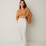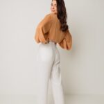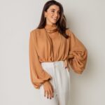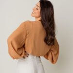Confeccionada em tecido leve e fluido, ela traz movimento e conforto com um toque de sofisticação. O grande destaque está nas mangas amplas bufantes, que trazem um ar contemporâneo e poderoso à produção. O decote profundo em V, equilibrado por uma gola com detalhe de torção e aplicação de acessório metálico dourado, adiciona modernidade com sensualidade na medida certa.