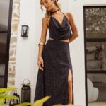 O tecido leve com estampa poá (bolinhas minimalistas) adiciona charme retrô e faz dessa produção uma opção versátil — perfeita tanto para o dia quanto para a noite. Combine com sandálias de tiras para um look chic ou rasteiras para um visual mais casual.