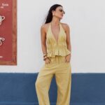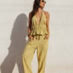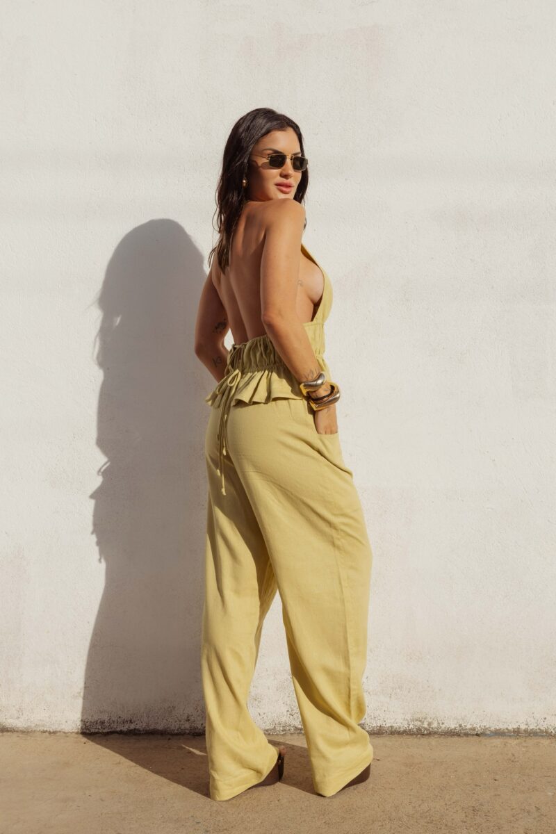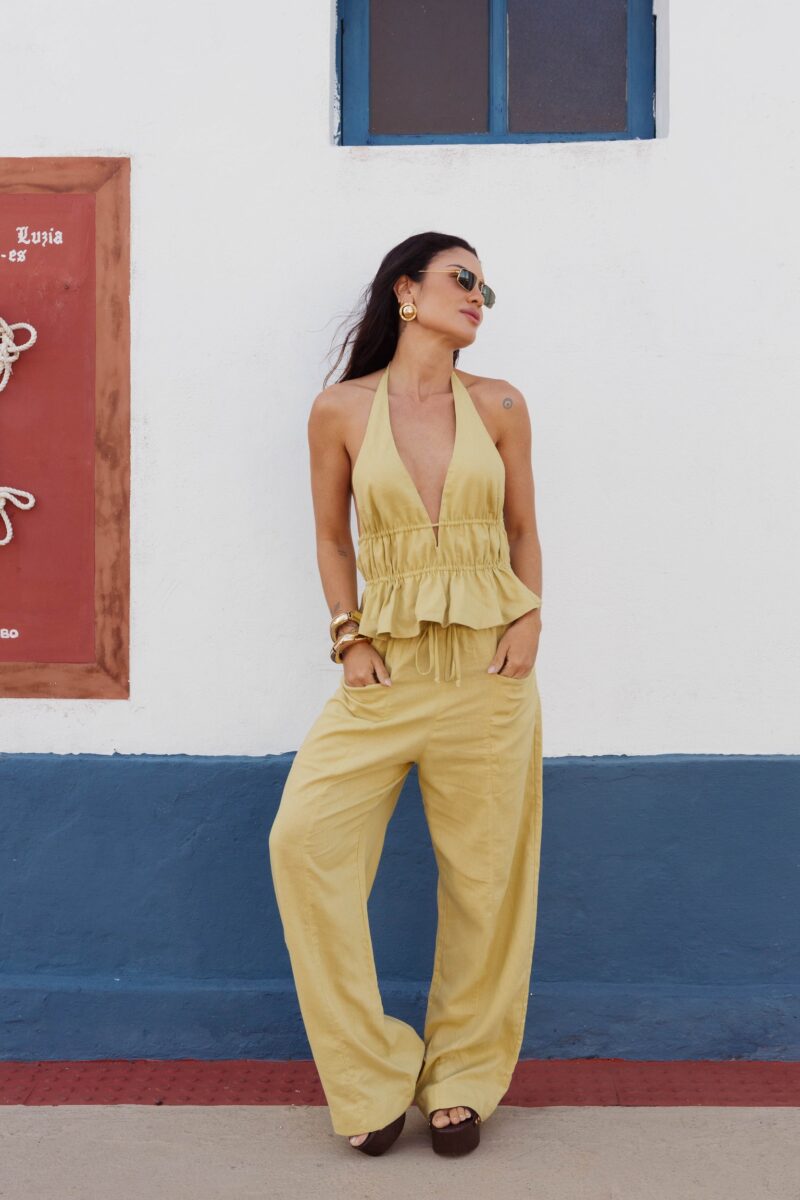 O conjunto Melon é composto por uma blusa com decote profundo e amarração nas costas, trazendo um toque sofisticado e sensual, e uma calça de modelagem reta e ampla, super confortável e elegante.