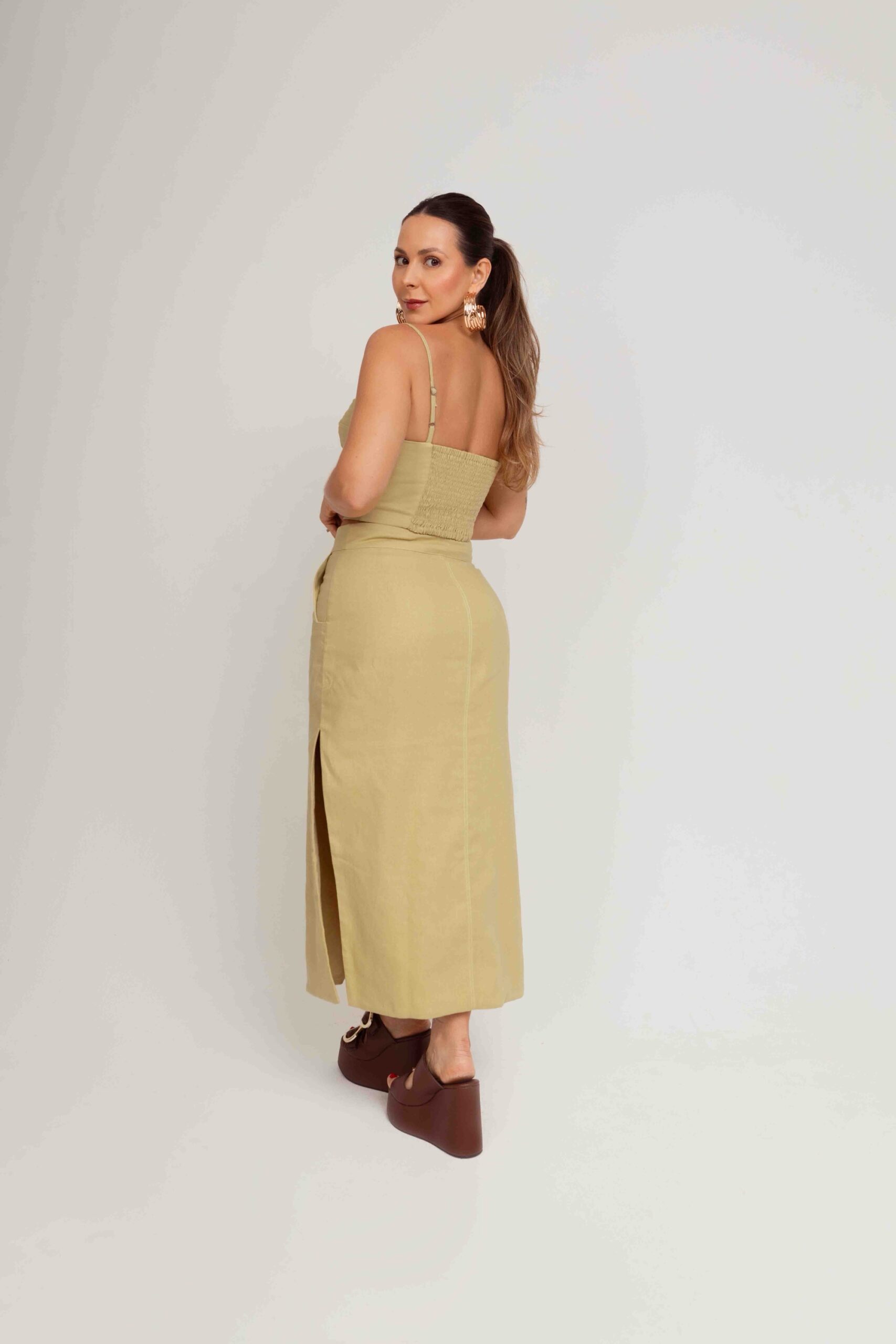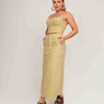 Conjunto Juliana é perfeito para mulheres que buscam sofisticação e estilo sem abrir mão do conforto. Composto por um cropped estruturado e uma saia midi de cintura alta, ambos confeccionados em tecido de linho, ele é ideal para diversas ocasiões, do casual chic ao look mais arrumado.