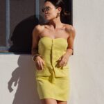 O conjunto em linho amarelo é composto por um top tomara que caia estruturado, com fechamento frontal em botões forrados que trazem sofisticação e um caimento impecável. A saia mini complementa o visual de forma leve e feminina, garantindo modernidade e versatilidade.